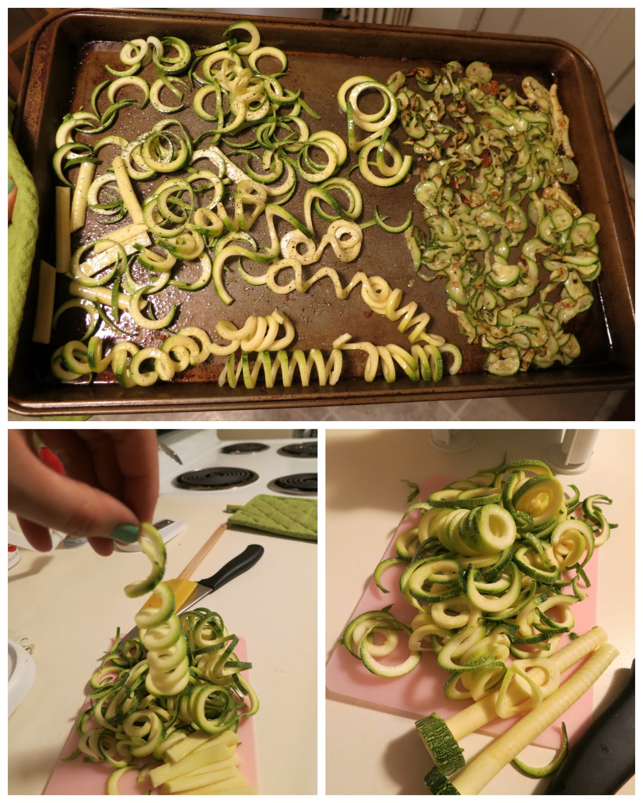 because i ask for weird things on my amazon wish list, i got a vege spiralizer from my sis for my birthday.  also due to the very small storage ability of my kitchen...things tend to get placed in my living room/coat closet and lie dormant for some time.  but behold.  zucchini!  spiralized!